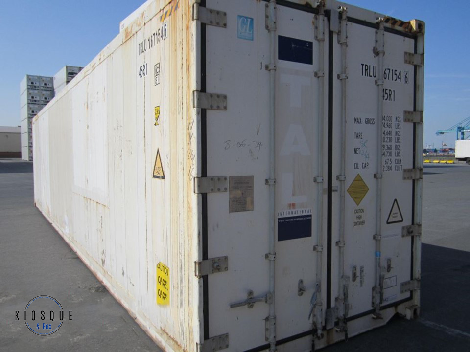 Le container maritime frigorifique 40 pieds REEFER dispose d'une couche d'isolant plus épaisse que les autres containers, il est donc plus petit qu'un container DRY, mais permet de préserver les marchandises entreposées à l'intérieur de gros écarts de température (effet isotherme) : idéal pour les récoltes agricoles ou produits chimiques.