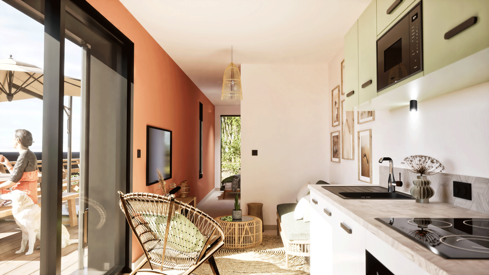 L'aménagement intérieur est pensé de manière à maximiser l’espace : une cuisine équipée, un espace de vie modulable, une salle de bain fonctionnelle et des rangements intelligents sont intégrés tout en respectant les normes et les tailles ISO.